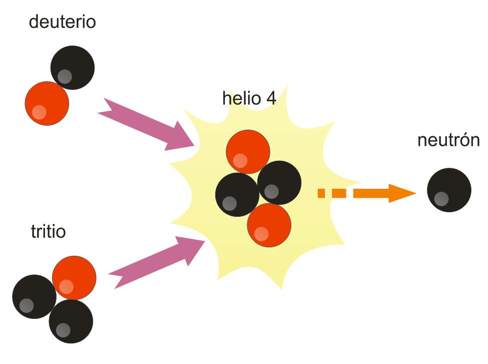 La reacción de fusión más prometedora que hay hasta la fecha es la unión del deuterio y del tritio, un isótopo de hidrógeno con dos neutrones. Por desgracia la partícula de desecho resultante es un neutrón, tal y como podemos ver en la imagen.