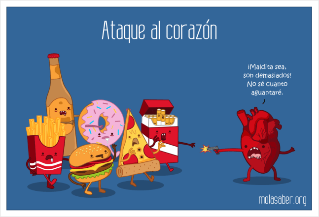 Y tal y como quiero recordar con la viñeta de hoy, muchos de estos factores se pueden remediar con una dieta sana, ejercicio y buenos hábitos. En otras palabras; comer de forma equilibrada, descansar bien, no darse a excesivos vicios y mover el culo gordo del sillón. Seguro que no te he descubierto la pólvora pero recuerda que las decisiones que tomas pueden traducirse en años extra para disfrutar y una mejor calidad de vida. Si encima por el camino nos echamos unas risas, estupendo. Espero haber colaborado hoy con eso. Hasta la próxima. 🙂