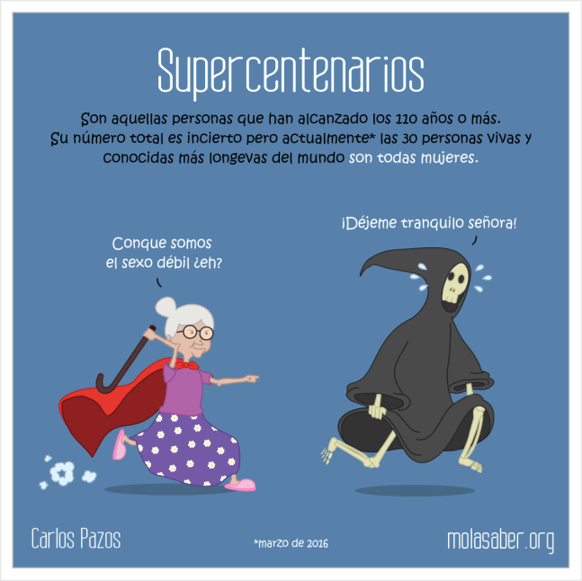 Ayer publiqué esta curiosidad coincidiendo con el día internacional de la mujer. Queda patente que  las mujeres tienden a vivir más que los hombres. Si quieres consultar la lista de las personas vivas más longevas te dejo este enlace en inglés de wikipedia que es bastante más completo que en español y, por lo que me han dicho, más fiable también. Hasta pronto.