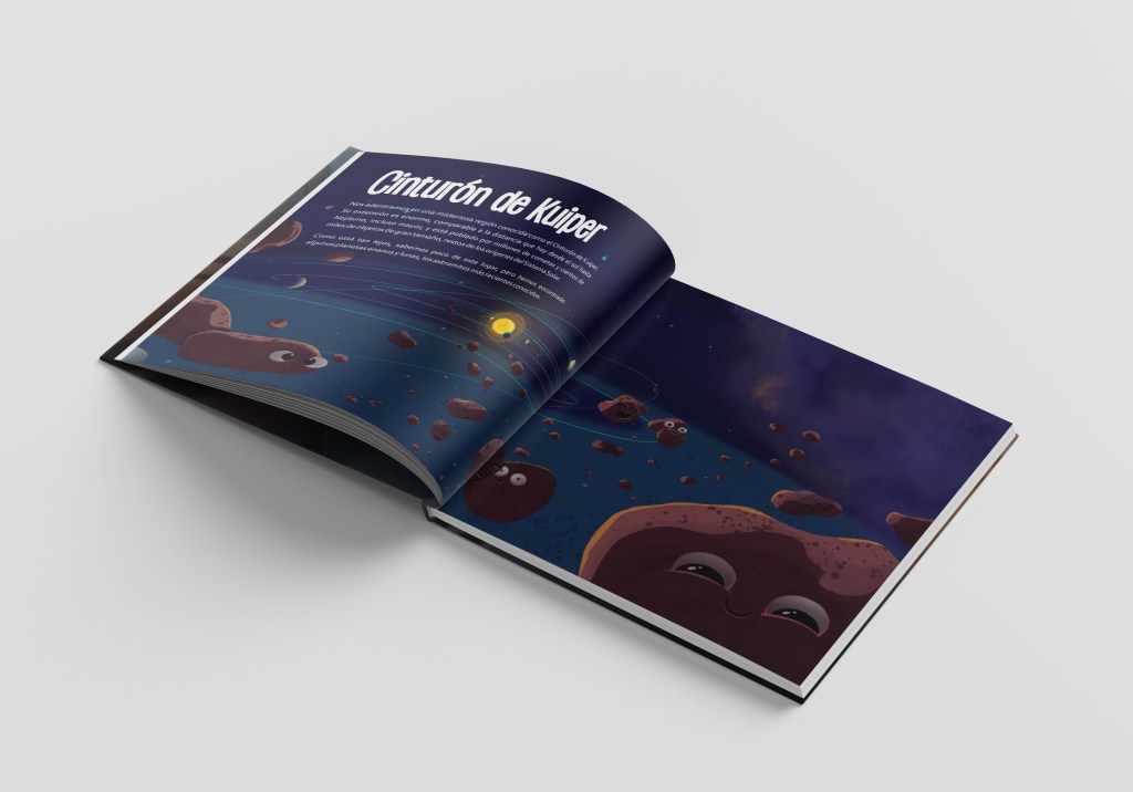 Y por supuesto, no solo planetas, he procurado que aparezcan las lunas más importantes, otros cuerpos celestes como asteroides famosos y regiones espaciales que no suelen verse en la literatura infantil.